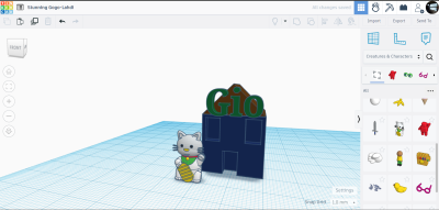 Now, raise 2 of the slabs up and slightly into the house to create indents. Do the same with the door on the ground floor. Once they are slightly inside of your house, you will then group all 4 shapes together by clicking your left mouse pad outside of the model and moving your cursor over the 4 shapes. Once they are all highlighted you can press ctrl+g to group. | To add text to your creation, select the “TEXT” option where you found the shapes. Once placed on the roof of your house, you will have the option to put whatever you want as your text. Reshape the text with the small boxes on the corners. You can also put a specific numbered size when you click on the boxes. If you want to change the color you can press the circle you see above the word “solid.” (This applies to every shape you see on screen.) | You're almost done with your creation. Now, add a small character. To get to this character there will be a heading on the tab to the right saying “Basic Shapes.” Click and select “Creatures & Characters.” Here, you can select anything you want! Once placed on your pad, it will look extremely large. |