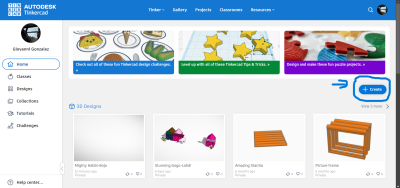 When you type in “Tinkercad” in your browser this screen will appear. The first option will be the cite we will use. | This will be what you see once you click. There will be a button that says “Create+” on your right side | Your Screen should look like this when ready to create. |